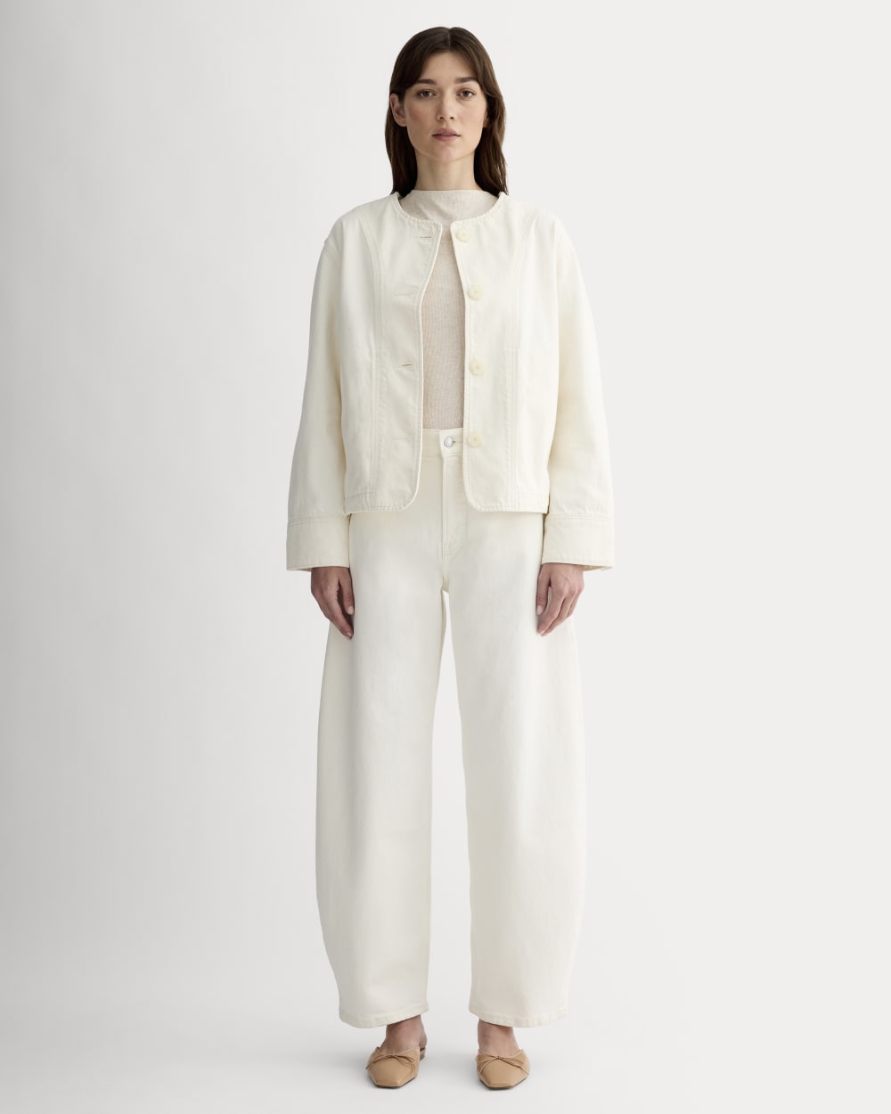 This piece features a relaxed fit. a button-front closure. barrel silhouette in non-stretch denim.