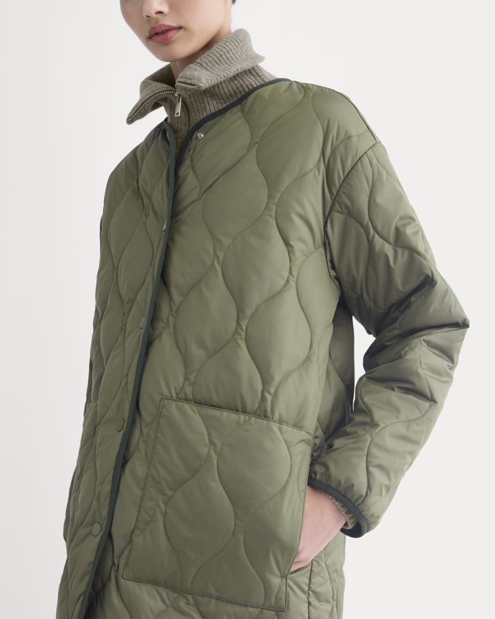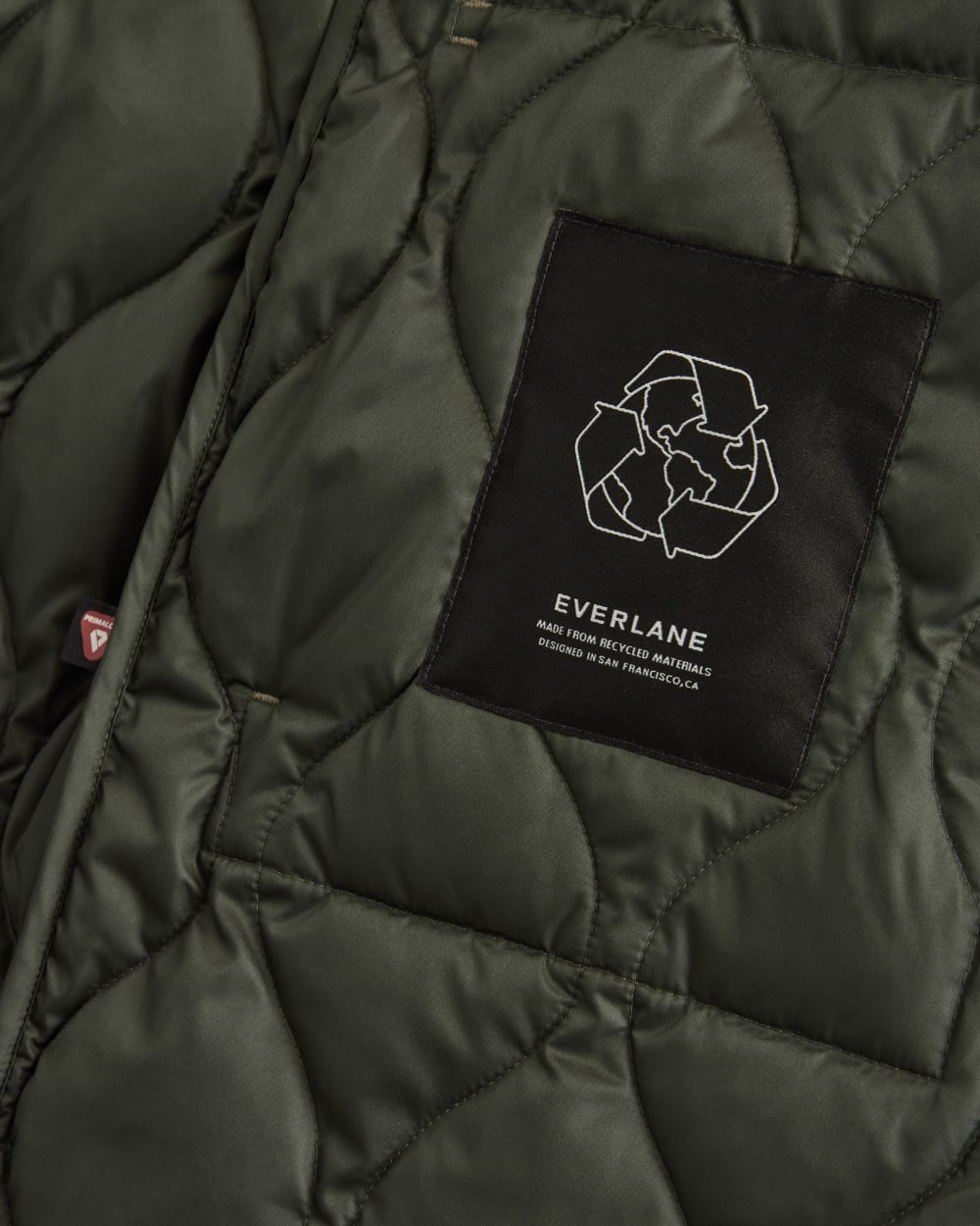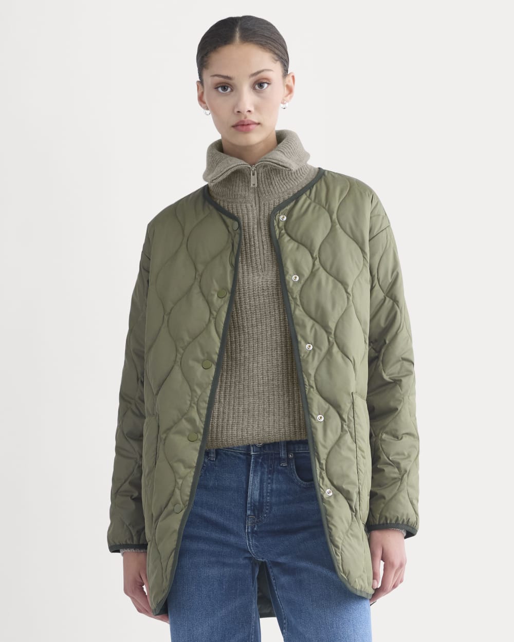 We took our favorite military-inspired liner and made it shorter for easy layering. Made entirely from 100% recycled polyester*. The Quilted Liner is lightweight. packable. and perfect for easy cold-weather layering. Plus. it features a classic crew neckline. snap fastening. handy side pockets. and a quilted design. Wear it as a standalone jacket or layer it under a coat for extra warmth without the weight. *Some of the snaps and trim aren’t 100% recycled. but we’re working on it. We’ve eliminated 90% of the virgin plastic from our supply chain. Learn about what we’ve done??and the challenges ahead??on our No New Plastic page.