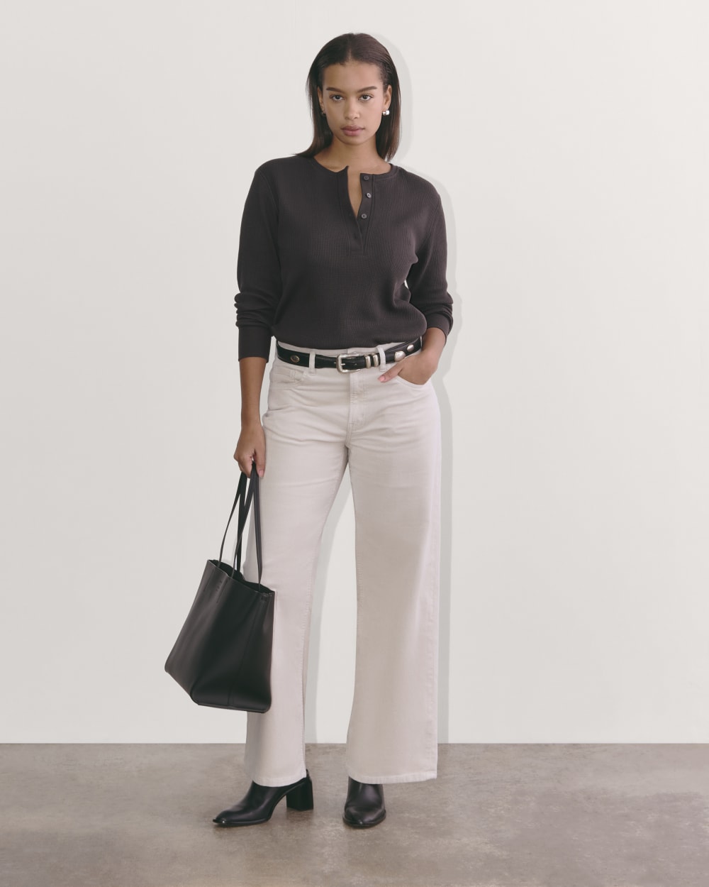 This piece features features a henley neckline. relaxed fit. long sleeves. ribbed hem and cuffs. front button placket. and is made using organic cotton in a waffle knit texture.